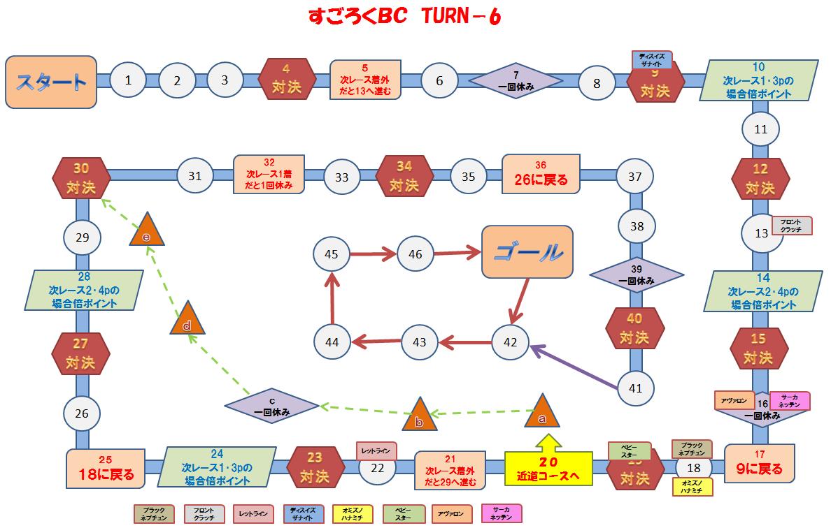19p ディスイズザナイト (2/1/5/2/外) 18p ベビースター (外/外/1/1/3) 18p サーカネッテン (3/外/2/5/1) 17p アヴァロン (1/2/3/外/外) 14p レッドライン (4/5/外/4/2) 12p フロントクラッチ (5/4/外/3/5) 10p ブラックネプチュン (外/3/4/外/外) 07p オミズノハナミチ (外/外/外/外/4) 順位逆転レース 福島 芝2000 晴・雨 8 ----- ブラックネプチュン 岩田 ○ 7 -▲○-- オミズノハナミチ 小牧 ○ 1 ◎◎-◎◎ アヴァロン 田中剛 ◎ 5 ○--▲▲ フロントクラッチ 高橋亮 ○ 2 --◎-- サーカネッテン 柴田善 ○ 3 △--△△ レッドライン 赤城 ◎ 6 ▲△▲○○ ディスイズザナイト 田中勝 ○ 4 △○△-△ ベビースター 津村 ○ 首振 ブラックネプチュン フロントクラッチ サーカネッテン レッドライン ベビースター レース条件 ブラックネプチュン vs オミズノハナミチ フロントクラッチ vs ディスイズザナイト アヴァロン 一回休み ベビースター 2・4p(2着/4着)だと倍進める レッドライン 復帰 今回は着順逆転レースに対決が2組もあります! 先着された馬が先に進めるルールです。 また当初順調だったアヴァロンは今回お休み ディスイズザナイトも現在転がり落ちてます ^^ ベビースターは3着以外ならOK お水はここが花道となるか? レッドラインは復帰です。 第6ターン 福島 芝2000 結果 TIME 1.58.6 4F-44.9 3F-32.9 雨・良 1着 アヴァロン - 2着 ディスイズザナイト 2 1/2 3着 サーカネッテン 3/4 4着 フロントクラッチ 1/2 5着 ベビースター ハナ 雨の中、最後の直線先頭にいたのはオミズノハナミチ それをアヴァロン・ディスイズザナイト・サーカネッテンが抜き去りました このレースは頑張らなくてもいいのにねぇ 着順逆転レース サイの目 6 ブラックネプチュン 同点 6 レッドライン 6 オミズノハナミチ 同点 5 ベビースター 4 フロントクラッチ 勝利 3 サーカネッテン 2 ディスイズザナイト 負け 休み 1 アヴァロン 休み 対決はフロントクラッチがディスイズザナイトに勝利!? オミズノハナミチとブラックネプチュンは引き分けと ここで休みになるのはディスイズザナイトのみという結果に! 当初TOPを走っていたのにいつの間にか最後尾に。 現在飛び出したのはレッドライン!ゆうゆうとひとり旅です。 続いてベビースター・ブラックネプチュン・オミズノハナミチが 魔のコンボを抜けました! サーカネッテンは見事にハマりましたね>コンボ 次レース状況 22 レッドライン 19 ベビースター 18 ブラックネプチュン 18 オミズノハナミチ 16 アヴァロン 復帰 16 サーカネッテン 一回休み 13 フロントクラッチ 09 ディスイズザナイト 復帰 PR