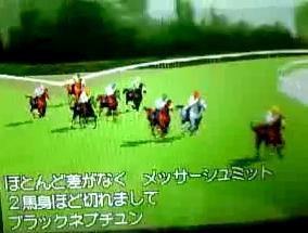 B組 △---- ディーヴィディ 横山典 ◎ 差 -▲--△ ズミーファイユー 水出 △ 追 JW ○△○▲▲ ルナウラジミール 田面木 ○ 先 --▲-○ インビジブルベル 四位 ◎ 差 △◎-△△ ルナエスプリーク 大庭 ◎ 差 ◎--○◎ メッサーシュミット 武豊 ◎ 先 --△-- ブラックネプチュン 岩田 ○ 差 ▲○◎◎- ティルピッツ 村田 ○ 差 首振りはいません B組はひっそりBC初登場のげっこうさんがいい印を2頭とも取ってますね。 同郷&「117」のチームメイトなので頑張ってほしいです。 また、前回総合4位のてんざんさんのティルピッツや ふふふさんのインビジブルベルも再登場! さてジョーカーですが、zouがJWを使ってます。 しょっぱなでポイントを4倍増してスタートダッシュを決めるつもりですが 思惑がうまくいくのか? それでは、新潟芝1000 B組 まもなくスタートです。 そろったスタート ルナエスプリークが好スタート、そのままハナを奪います。 2番手ににルナウラジミール、ルナ冠がレースを引っ張ります。 5-[36]-[741][82] 残り200mまでルナエスプリークが粘ってましたが、 ここでメッサーシュミットが交わして前に出た! さらにはティルピッツが差を詰めてくる~ インビジブルベルもでてきた 3馬身 2馬身 1馬身と差をつめていく 届くのか~~~~~~~~~ 新潟 芝1000 晴 良 B組 15p 1着 ティルピッツ TIME 0.54.7 4F-43.4 3F-32.6 10p 2着 インビジブルベル クビ 08p 3着 ブラックネプチュン 1 05p 4着 ディーヴィディ クビ 03p 5着 メッサーシュミット 3 着外 それぞれ 1p 獲得 早めに抜け出したメッサーシュミットをさらに交わした ティルピッツが猛追するインビジブルベルを抑えて勝利! インビジブルベル、ブラックネプチュン、ディーヴィディと 同じペースで最後伸びていきましたが、 最後の一伸びがなく、逆転するにはいたりませんでした。 5着には早め抜け出しから一気に逆走したメッサーシュミットが残りました。 てんざんさん&ふふふさんは2頭とも掲示板入りです♪ げっこうさんの2頭はこのコースで1・2番手の展開は厳しかったですね。 次走もダートと苦手なレースですが挽回してほしいです。 あっ、私のひっそりBCはすでに終了しました。 ほとんど画面でも実況もされてなかったですが、 メッサーシュミットの逆走と同時に逆走してました... 素点順位(新潟1000 AB組終了時) 18p 未定(ミズさん) 18p 海と空の番人 18p 鈴と黒 11p ムズムズムズム 09p おてんば娘's 06p マイラーズ 06p ダーティーペア 02p ダート苦手ーズ 総合順位(新潟1000 AB組終了時) 18p 未定(ミズさん) (15+3=18p) 18p 海と空の番人 (15+3=18p) 18p 鈴と黒 (10+8=18p) 17p おてんば娘's (8×2+1=17p) 11p ムズムズムズム (10+1=11p) 09p ダーティーペア (5+1×4=9p) 07p マイラーズ (5+1×2=7p) 02p ダート苦手ーズ (1+1=2p) 競走馬ランキング(新潟1000 AB組終了時) 15p バオバブ (1) 15p ティルピッツ (1) 10p コアリズム (2) 10p インビジブルベル (2) 08p ラインオーバー (3) 08p ブラックネプチュン (3) 05p ディーヴィディ (4) 05p ティルフィング (4) 03p キキウウエ (5) 03p メッサーシュミット (5) 01p ストイシズム (外) 01p ストールメイス (外) 01p グローイングアップ (外) 01p ルナウラジミール (外) 01p ルナエスプリーク (外) 01p ズミーファイユー (外) PR