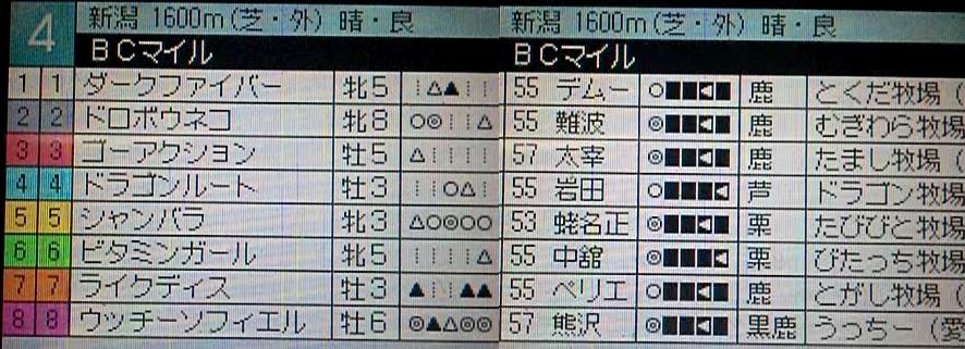 お待たせしました、敗者復活戦のアップです 決勝の舞台にのし上がる2頭はどの馬か? 組分けをランダムにし、6頭A組B組に分けて試合が行われます A組 出馬表 差3追3 B組 出馬表 差4追2 A組の展開 おっとザフィーバーズが出遅れ! 前列 ダークファイバー・ゴーアクション 中段 ストールディザイア ドラゴンルート・ビタミンガール 後方 ザフィーバーズ 直線に入ってもダークファイバーが逃げる! 後方ぴったりとゴーアクション 結構離れてビタミンガール、ドラゴンルート、ストールディザイア 後続から画面が戻るとゴーアクションが前に出てる! そのまんま~ 新潟1600m 晴・良 1.30.1 4F43.6 3F32.3 1着1番 ゴーアクション - 2着5番 ダークファイバー 3 1/2 3着4番 ビタミンガール 1 1/4 4着6番 ドラゴンルート 1 1/4 5着3番 ストールディザイア 2 着外 2番 ザフィーバーズ 前が止まらず!最後にゴーアクションが伸びて1着 ダークファイバーは惜しい2着 ザフィーバーズはよもやの出遅れ B組の展開 ガラ好スタート 前列 シャンバラ・ライクディス 中段 ウッチーソフィエル・ドロボウネコ 後列 ガラ ミソモ 直線逃げるライクディス しかし逃がしはしないとドロボウネコ 一直線にケツアタック! その横をシャンバラが抜ける 新潟1600m 晴・良 1.29.8 4F42.7 3F31.2 1着6番 シャンバラ - 2着1番 ドロボウネコ 2 3着2番 ライクディス 2 1/2 4着4番 ウッチーソフィエル 3/4 5着5番 ガラ 1 3/4 着外 3番 ミソモ シャンバラがうまく立ち回り1着 しかしケツくらっても余力のあったドロボウネコが2着 ライクディスが最後の粘り3着 敗者復活戦 AB戦 ポイント 5p ゴーアクション 5p シャンバラ 4p ダークファイバー 4p ドロボウネコ 3p ビタミンガール 3p ライクディス 2p ドラゴンルート 2p ウッチーソフィエル ここまでが最終戦進出 1p ストールディザイア 1p ガラ 0p ザフィーバーズ 0p ミソモ で、そのまま最終レースに突入~~~ 敗者復活戦 最終レース 最終戦 出馬表 差6追2 レース展開&結果 最終戦の展開 B組同様シャンバラとライクディズが前へ飛び出し 前レースと同じレース運び 前列 シャンバラ・ライクディス 中段 ウッチーソフィエル・ダークファイバー ゴーアクション・ドロボウネコ 後方 ビタミンガール・ドラゴンルート 直線飛び出したのはシャンバラ しかし思ったほど差を広げられず 後ろからライクディスが飛び出そうとするが シャンバラのケツにドッキング 脇を抜けたのがゴーアクション しかし最後の最後でドロボウネコ 新潟1600m 晴・良 1.29.6 4F42.8 3F31.4 1着2番 ドロボウネコ - 2着3番 ゴーアクション 2 3着7番 ライクディス 3/4 4着8番 ウッチーソフィエル 1 1/4 5着1番 ダークファイバー 2 1/2 着外 4番 ドラゴンルート 5番 シャンバラ 6番 ビタミンガール 前半の2レースと違い、後ろからどんどん抜いていく展開! マイル戦ではこの展開が多いかと思ってたんですけどね 最終ポイント 9p 04ドロボウネコ 9p 18ゴーアクション ここまでが決勝進出 6p 19ライクディス 5p 03シャンバラ 5p 11ダークファイバー 4p 07ウッチーソフィエル 3p 16ビタミンガール 2p 08ドラゴンルート 1p 10ガラ 1p 13ストールディザイア 0p 05ザフィーバーズ 0p 06ミソモ 決勝にコマを進めたのは B組2着 最終1着のドロボウネコと A組1着 最終2着のゴーアクション この2頭が決勝に進出です 天候待ちになりますが そしてスーパーサブ候補としては 24p 03シャンバラ 21p 07ウッチーソフィエル 5p 11ダークファイバー 4p 16ビタミンガール -5p 05ザフィーバーズ -12p 08ドラゴンルート -9p 19ライクディス -13p 13ストールディザイア -14p 10ガラ -15p 06ミソモ シャンバラとウッチーソフィエル、 予選で強さを見せましたが 準決勝・敗者復活戦でいまひとつ踏ん張れませんでした はたして決勝10頭立てで天候は乱れるのか? それとも... うーん、スーパーサブは出場できず PR