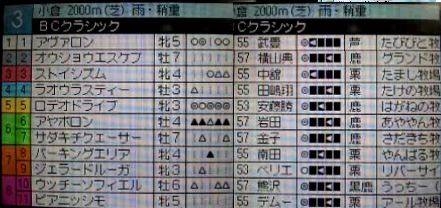 私が10分のうちにどれだけパスうちできるかで 出走馬数が変わりますw 最小出走数は10頭 また30秒ほどでパス入力できるパーキングエリア(PA:ksp61-1.50耐-先行) が数合わせ&ケツアタック要因で必ず出走します 獲得ポイントは 1着5p 2着4p 3着3p 4着2p 5着1p 着外0p 予選通過ポイントは14p以上 会場:中京・小倉・福島・札幌各2000mのローカルサーキット パス入力方式ですが1戦目はPA→登録順 2戦目以降はPA→前走1着馬→出走回数の少ないポイント上位の登録順 ※序盤は未出走馬が最優先出走となります そして予選アップ方法ですが、レース数が多いので1節ずつダイジェストでアップします ダイジェスト版は初めてやるのでやるごとにver.UP?するかもしれません ではもうちょっとお待ちください 第1節は携帯修理中でしたので代替機で処理したのですが 手ぶれ補正のせいなのか、はたまた光度調整のせいなのか 台座固定しているのですがグラグラです 多少みぐるしいのは勘弁です なお、パス打順の名称は勝手に略称化してます、わかりずらい方もいますがご了承ください 01R 中京2000m 雨・不良 TIME 1.59.1 4F-45.1 3F-33.0 1着 1番 ロデオドライブ - 2着 8番 オニギリ クビ 3着 3番 アウトレイジ 2 4着 2番 パーキングエリア 1 1/2 5着 6番 ホワイトロリータ 1 3/4 パス入力順 全12頭 PA→安定C→赤星→荒運転→夕食録→塩出戸→出零時→白王→御握り→S小苺→白少女→星光 しょっぱな1Rはあいにくの雨 逃げ脚質のホワイトキングダム・レッドスターがレースを引っ張るも 直線で力尽き、先行脚質のロデオドライブとオニギリが差し切る! おまけでパーキングエリアが4着と邪魔する仕事を果たす ****************************** 02R 小倉2000m 雨・稍重 TIME 1.59.8 4F-46.4 3F-34.5 1着 1番 アヴァロン - 2着 3番 ストイシズム 1 1/4 3着 5番 ロデオドライブ ハナ 4着 2番 オウショウエスケプ 1/2 5着 6番 アヤポロン クビ パス入力順 全11頭 PA→荒運転→超柔煙→氷菓娘→貞準星→逃王将→禁欲主義→彩月桂→拳王終→内天使→美林檎 2Rも雨の中、ピアニッシモが出遅れ 終始先頭を走るアヴァロンが、追いこむロデオドライブを振り切り勝利! これで、連続で最内枠が勝利です ****************************** 03R 福島2000m 晴・良 TIME 1.57.8 4F-44.5 3F-32.6 1着 4番 オニギリ - 2着 5番 グランディパルサー 1 1/4 3着 10番 アウトレイジ 3/4 4着 11番 アヴァロン 3 5着 9番 ホワイトロリータ 3/4 パス入力順 全11頭 PA→美林檎→黒呂帯→地上波→東光王→御握り→禁欲主義→出零時→逃王将→白少女→彩月桂 天候も晴れてそろったスタートになった3R 逃3先2できっちり分かれた中盤から 直線飛び出したのはダークロベルト、それをアヴァロンがかわすも 先行馬オニギリ・グランディーパルサーがさらにかわす ****************************** 04R 札幌2000m 晴・良 TIME 1.57.6 4F-445.2 3F-33.4 1着 1番 ディナローグ - 2着 7番 スターライト 3 3着 4番 アピアニッシモ 1/2 4着 2番 ストールシャオメイ 1 1/4 5着 5番 アンテーシーッテカ 1/2 パス入力順 全11頭 PA→御握り→地上波→安定C→赤星→夕食録→塩出戸→白王→S小苺→星光→超柔煙 グランディーパルサーがちょっと出遅れ ぶっ飛んできたディナローグに飲み込まれてしまいました オニギリは1着で1抜けのチャンスでしたが残念でした ※逃げ馬訂正しました 第1節result 第1節は4戦中3戦が1番枠の勝利 第2節は、いかに1番枠を取るかがカギとなりそうですね 08先 オニギリ 9p(3戦1/1/0/0/0-1)リーチ 03先 ロデオドライブ 8p(2戦1/0/1/0/0-0) 20逃 アヴァロン 7p(2戦1/0/0/1/0-0) 06差 アウトレイジ 6p(2戦0/0/2/0/0-0) 04差 ディナローグ 5p(2戦1/0/0/0/0-1) 11差 スターライト 4p(2戦0/1/0/0/0-1) 16逃 ストイシズム 4p(2戦0/1/0/0/0-1) 22差 グランディパルサー 4p(2戦0/1/0/0/0-1) 12差 ピアニッシモ 3p(2戦0/0/1/0/0-1) 09差 ストールシャオメイ 2p(2戦0/0/0/1/0-1) 10差 ホワイトロリータ 2p(2戦0/0/0/0/2-0) 15差 オウショウエスケプ 2p(2戦0/0/0/1/0-1) 01差 アンテーシーッテカ 1p(2戦0/0/0/0/1-1) 17差 アヤポロン 1p(2戦0/0/0/0/1-1) 13先 ジェラードルーガ 0p(1戦0/0/0/0/0-1) 14差 サダキチクェーサー 0p(1戦0/0/0/0/0-1) 18差 ラオウラスティー 0p(1戦0/0/0/0/0-1) 19差 ウッチーソフィエル 0p(1戦0/0/0/0/0-1) 21逃 ダークロベルト 0p(1戦0/0/0/0/0-1) 23差 ブレニンイースレイ 0p(1戦0/0/0/0/0-1) 02逃 レッドスター 0p(2戦0/0/0/0/0-2) 05差 ジオデトリアーノ 0p(2戦0/0/0/0/0-2) 07逃 ホワイトキングダム 0p(2戦0/0/0/0/0-2) オニギリがリーチ掛かってますが、3戦消化してますので 次節はひょっとしたら出番なしです そろそろ外枠&差し馬の活躍がみたいなぁ 今回から出馬表を画像にしてみました 変形サイズということで 携帯だと読めない可能性があります 携帯で当BCをご覧のかた、PCで見れなかったという方 ブログに書き込みしてみてください、なんとかするかもしれません PR