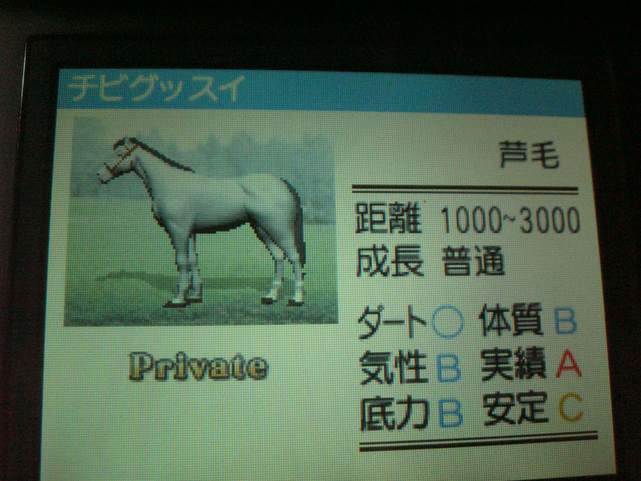 印が◎◎-◎△と自分の持ち馬じゃないみたい^^ 適正距離だし初登場1着期待してます! ちなみに忘れていたけど、同一条件のサラブレは △△-△-と、まずまずの印でしたが着外、残念 次回開催の新潟1000は ガイエスハーケンではちょっと足りないかなと思い サラブレ未購入です(^^ゞ 入賞してたら買ってたかも んで表題の件なんですが、今日もちょこっとプルピットという事で 仕事終わりに路中生産、4セットめに 元気 SP 父似 ST2耐 の馬が登場! コメントで2ヶ月、放牧耐えで3か月 1月4週目に入厩で、そこから6月4週までえウッド強めを×2で42本 2耐分のスタミナがあと13本なので 7月 w2本 1レース 8月 w1本 1レース 9月 w1本 1レース 10月 w3本 0レース 11月 w1本 1レース 12月 w2本 0レース この時点であと3本ですので 1月3週までにw3本やってパスチェック 6月の時点でベスト体重が530kg 1月には534kgになってました 1/4 542 ひもる 2/1 w544 すりす w542 ぶとび 2/2 548 おけう w546 ぞすせ w544 ふてび 2/3 548 おけう 1本目は変化、2本めは変化なしになるので 訂正 上限3000ですね、2本目変化だと2.5耐になって3200だよね? 現在仕上げ中ですが、正直弱いですね... PAから新1000で印はとったので本物間違いないのですが、 ゲーム中◎◎▲▲▲でサブパラ崩壊とか、 マイルCSの1勝しかGI勝ってないとか 残念な感じ。 とりあえず差しと先行のパスとったら追記します 仕上げました、正直がっかりです~ まさかダ適も○とは(>_<) GI2勝目を目指しましたが...勝てん! 早々にあきらめました。 牡4才 534kg 芦毛 津村 重○ 差 ぬぞぼひべ がねうけへ こえつがり れちけほぶ ごくやぼい ぺずけずも へげんんか すぐりぼへ しめや 牡5才 津村 先 わよごらつ べあばとが みしいぼに はあはだび ぞんげそど ぜらいごや おしむひい ぞちごたる あびき 東京D2100でサザンとオフレッサーを含めた8頭で試走しましたが サザンから左2◎とっていきます チビグッスイが強いというより、 かなりサザンのダ適低い模様。 レースもチビグッスイが勝ってるし。 ちなみに馬名のチビグッスイは チビ→おしり グッスイ→差す で浣腸の意味です( 一一) PR