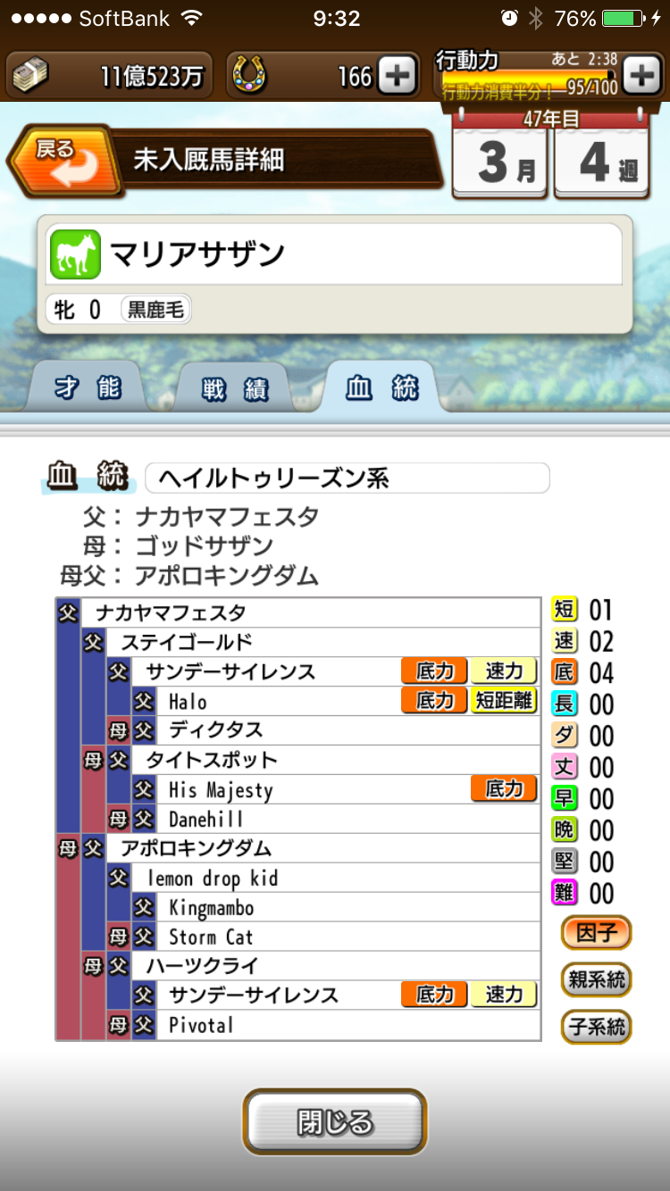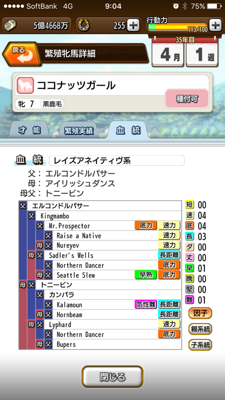 1-10頭目 272戦38勝 2着28回 3着16回 着外190回 G3 2勝 11-20頭目 368戦50勝 2着28回 3着19回 着外271回 G2 1勝 21-30頭目 342戦53勝 2着34回 3着28回 着外227外 G1 2勝 G2 3勝 G3 6勝 31-40頭目 357戦59勝 2着39回 3着36回 着外223外 G1 3勝 G2 1勝 G3 9勝 だいぶ牧場経営が楽になってきました G1 2勝のスピスタCC牝馬ゴッドサザンのおかげですね 繁殖としてもなかなか良くスピスタBCの牝馬を排出して母系のラインとしても期待できます またBCでたまにメガネっ子をゲットしてくれるのが大きいですね ちなみに現状のつないでいる母系は2つ 一つは初期牝馬のウイリアムチョコからの系統で こちらは現在6代目 合間にG1 1勝馬をだすものの配合も適当なので ほぼスピスタEEがデフォで牝馬をつなげるためだけのラインです 10代目つないだ時に突然変異でもこないかな もうひとつがピストルランブからのラインで ハーツクライ×ピストルランブでDD DDにアポロキングダムでCCのゴッドサザン いまこのゴッドサザンに トウカイテイオー 牝 スピスタDC フサイチコンコルド 牡 スピスタDE ファスリエス 牝 スピスタDD ナカヤマフェスタ 牝 スピスタBC ナカヤマフェスタ 牡 スピスタCC BCの馬をメインにDC、DDにも種付けしつつスピスタ伸ばしたい
