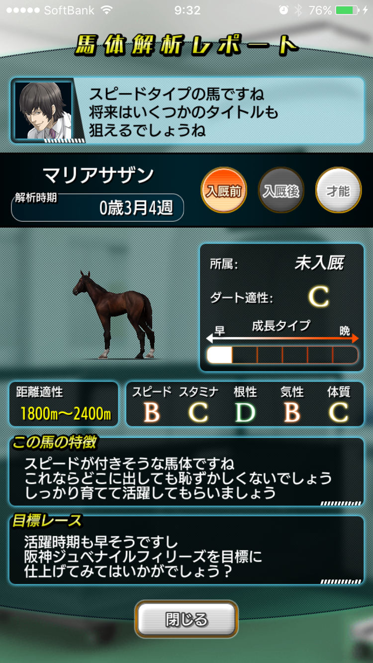 1-10頭目 272戦38勝 2着28回 3着16回 着外190回 G3 2勝 11-20頭目 368戦50勝 2着28回 3着19回 着外271回 G2 1勝 21-30年目 342戦53勝 2着34回 3着28回 着外227外 G1 2勝 G2 3勝 G36勝 29頭目にしてようやくG1勝利できました すきまのヴィクトリアとエリ女ですがw 27頭目あたりからようやく資金が10億超えるようになったので (2頭で10億ちょっと繁殖の無駄遣いがありましたがw) 幼駒の解析を始めました 毎年1頭ずつ生産してますので、10億たまったら解析し翌年までに2億貯める このサイクルが楽しくなってます つまり爆発していないということなんですが そんな中、36頭目がスピスタともにCと うちの牧場では初めてのスタコメを見せてくれる牝馬が誕生 現在2歳調教中なので繁殖入りまで含めて楽しみです こいつが稼いだら馬運車買う予定