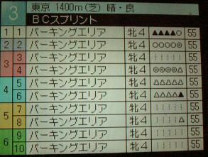 A組 ----- チーズオカキ 郷原 ○ 差 ◎◎-△○ アヴァロン 田中剛 ◎ 差 ----- ベビースター 津村 ○ 差 -○▲▲△ ウッチーラファエル 熊沢 ◎ 追 △-◎○◎ グローイングアップ 蛯名正 ◎ 差 ▲▲--▲ ティルフィング 南井 ◎ 差 J △△○-△ ブラスレイター 秋山 ◎ 差 ○-△◎- ウッチーハミエル ペリエ ◎ 差 乗り代わりは8番 首振り無し 東京マイルA組はあいにくの雨となってしまいましたね。 なんか3組目開催は毎回条件が悪いような... さぁ2戦分のポイントだけで、トップを独走している、 ☆TSUSHIさんがここで高ポイントを稼ぎ、優勝を近づけるのか? うっちーさんがここで☆TSUSHIさんを抑えて ポイント互角に持ち込むのか? 素点は高いがジョーカーポイントがいまいちのもっぷさん(ぁ 素点だけならトップなのですけどねぇ 最終戦に可能性を残すためにはぜひここでトップを取りたいところ。 同様に1枚目のジョーカー使用に失敗してしまったゆうすけさん、 今レースはティルフィングがジョーカー使用です。 今度はうまくいくか? それでは、東京1600 A組 まもなくスタートです。
