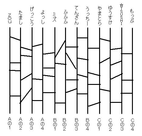 厳正(笑)なる抽選の結果、以下の組み分けとなりました。 A1 よっしさん A2 みずさん A3 ゆうすけさん A4 たましさん B1 ふふふさん B2 zou B3 げっこうさん B4 てんざんさん C1 ☆TSUSHIさん C2 もっぷさん C3 うっちーさん C4 やまとらさん ぱすてむでのパス登録順は A1-1 A2-1 A3-1 A4-1 A1-2 A2-2 A3-2 A4-2 (-1、-2)は登録時の順番です 以降のレースは1戦目の結果から、素点でのチーム得点順位を用いて ある法則に従い以下の入力順から選択して入力していきます。 A組なら パターン1 1位・2位・3位・4位 パターン2 2位・3位・4位・1位 パターン3 3位・4位・1位・2位 パターン4 4位・3位・2位・1位 パターン5 1位・3位・2位・4位 パターン6 2位・4位・3位・1位 パターン7 3位・1位・4位・2位 パターン8 4位・2位・3位・1位 B組なら5位~8位、C組なら9~12位の順となります。 法則は全レース終了後に発表いたします。 また同ポイントの際は登録順が上位と致します。 3レース以降は前レースのみのポイント上位で順番を決定いたします。 やりながら失敗あった際は、逐次訂正させて頂きます。 あらかじめご了承下さい。m(__)m それでは、そろそろレース処理しま~す。