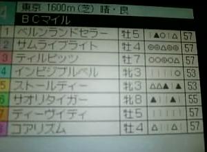 ひっそりBC最終レースです。 昨日3行ほどキーボードたたいた所で9時半 娘を寝かしつけようろしたら、一緒に寝てました... 起きたら2時半 というわけで阪神芝2400です。 よもや有馬のコースがないとも思わず、直前でのコース変更 申し訳ないです。 さあ出走馬の印情報です。 阪神 芝2400 雨 良馬場 1 コアリズム 柴田大 差し ………△… たまし 2 ジャイロナカメ 小牧 逃げ …………… ツカペリ 3 バオバブ 安藤勝 差し ○…◎◎▲ ミズ 4 ベルンランドセラー 岩田 差し △◎▲…○ うるき 5 キングポニョ 長谷川 先行 …○……… グッチー 6 ティルピッツ 村田 差し ▲△○○△ てんざん 7 ティルフィング 南井 差し ◎▲…▲◎ ゆうすけ バオバブとティルフィングがグリグリ2つ、 ベルンランドセラーが左2を奪っております! たとティルピッツもいい感じですね では、そろそろレーススタートです