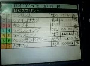 お昼休みとはいえ、仕事中に パス打ちは何とか2回目で成功(12秒残しで達成) もし次回開催は8頭デフォでできればいいんだけど。 なお、今回から携帯で写した動画から写真を抜き出して 表示したいと思います。 携帯動画がPCで再生できれば、意外と知られていないPCの基本機能 プリントスクリーンKeyを使えば簡単に写真ができます♪ (PCのグラフィックボードにちょっと依存しますが) さて出走馬の印状況です。 東京 芝1600 晴れ 良馬場 1 ベルンランドセラー 岩田 差し …▲○…△ うるき 2 サムライブライト 四位 先行 ◎◎△◎◎ 天道虫 3 ティルピッツ 村田 差し ○○◎○△ てんざん 4 インビジブルベル ペリエ 差し …………○ ふふふ 5 ストールディー 中舘 差し △△▲…▲ よっし 6 サオリタイガー 菊沢徳 差し ▲……▲… まさとし 7 ディーヴィディ 後藤 追込 …………… zou 8 コアリズム 柴田大 差し △……△… たまし 抜群の印をとっているのはサムライブライト 根性以外はグリグリです 続いてはティルピッツがいい感じ♪ インビジブルベル号はやはり乗りかえです 先行のサムライブライト号がレースを引っ張って行きそうです やっと晴れの良馬場でレースができるので 各馬思いっきり走ってもらいたいですね |