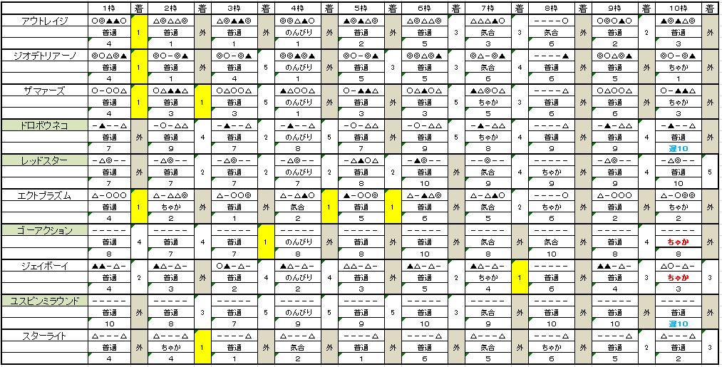 1位 62p(1/2/2/1/1-3)ジェイボーイ 2位 61p(3/1/0/0/0-6)エクトプラズム 3位追56p(0/4/0/2/1-3)レッドスター 4位 49p(2/0/1/0/2-5)ザマァーズ 5位 47p(1/1/2/0/0-6)アウトレイジ 6位 44p(1/0/2/1/1-5)ジオデトリアーノ 7位 40p(1/1/1/0/0-7)スターライト 8位追36p(1/0/0/3/0-6)ゴーアクション 9位追35p(0/1/0/3/2-4)ドロボウネコ 10位追30p(0/0/2/0/3-5)ユスピンミラウンド 大接戦のおまけマイルは最終レース逆転で ジェイボーイが1p差でうっちゃりました! 1着は1回ですが全順位をとり着外3回のみの安定感 あまり前に行かず後ろに下がらず、かなりうまく走ってました 2着のエクトプラズムは本編最下位からの怒涛の3勝1回2着 あとは着外なのがメリハリあっていいですねw 3着に追込みレッドスター、1着は取れないものの着外3回の安定ぶり 以下、ザマァーズは2勝あげるもポイント伸びず アウトレイジは最後に勝って前回よりもポイントアップ! 初戦勝利のジオデトリアーノ、3回も先頭はしっちゃいました スターライトも前回より崩れてますね、ただ1着はゲット ゴーアクションは差し追込みあまり変わらずww ドロボウネコは入賞するも前に行けず ユスピンは完全にスタミナが足りないですね 今回のレースで勝手に推測すると 追込みでは場を荒らすことはできるけど、勝つのはかなり厳しい マイルの攻略ポイントは基礎+根性の微妙なバランスなんですかね~ 最後にエクセルデータ、前回のものと比べるのなにか見えてくるのかな? それにしてもJ-Boyの印の薄さはすごいな~