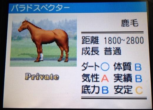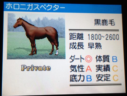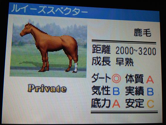 当初クラフ×クオルで母父作成を試みていましたが あまりスタミナの手ごたえがよろしくなくて 種牡馬&繁殖データとにらめっこ するとあいだにバウンダリーを挟めば クラフ×(バウンダリ×クオル)で面白発生 繁殖の方の初期牝を変えれば最終ニトロは変わらない よし!これだ!! と思ったのはいつごろだったかなぁ~ とりあえずバウンダリ×クオルでSPSTコメ有の繁殖ができ クラフ×バウ牝&バウ×クオルの生産体制まで整えてましたが なかなかまとまって生産できずに今日まで来ました で、本日最初のセットでバウ×クオルでSPSTありが誕生 即セーブして2頭体制で次セットへ 何セットか不受胎しないタイミングを探しているうちに 2頭の牡馬がフルコメ! 育ててみるとSPが不足でG1がなかなか勝てない 諦めかけながら続けていた4歳の天皇賞秋で勝利! 迷いつつも、どうせだめならやり直せばいいや、と思いセーブ 結果は う~ん、下限が2000ってのがちょっときついか? ちなみにあと1頭は ダート◎じゃないので残念 で、繁殖側の初期牝をセリで購入 父カーリアンのカンザシとアンネット こいつにサンデーを3年連続、せっかくなのでクラフ×バウ牝を1年のみ すると3セットほどこなすとクラ×バウの牡馬がフルコメ 入厩しながら先に進むと3年めのサン×カンの牝馬がSPSTあり もともと次が虹なのであまり深く考えずセーブ 牡馬が皐月賞勝ったのでもう1回セーブしてパラをみると う~ん、これも微妙だなぁ とりあえず先にすすんでみます ついに 買っちゃいました。 iphone4s 予約したのは予約開始から2日後 実際手に入れたのは発売日翌日 思ったよりすんなり手に入れることができました 今のところ非常に快適につかえてます いじりすぎて夕方に電池がギリギリになるのがたまに傷ですが カメラも動画も今までの携帯と比べて段違いのクオリティw そろそろうずうずしてきてますよ(ナニガ あとはブログに写真添付する方法とかしらべなきゃなぁ PR