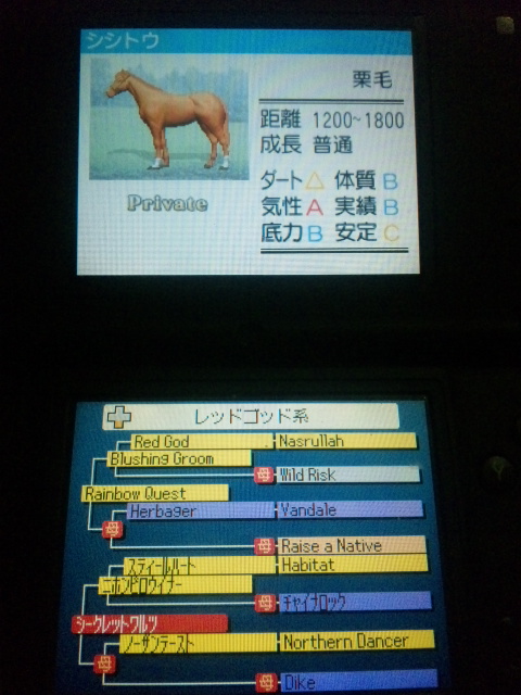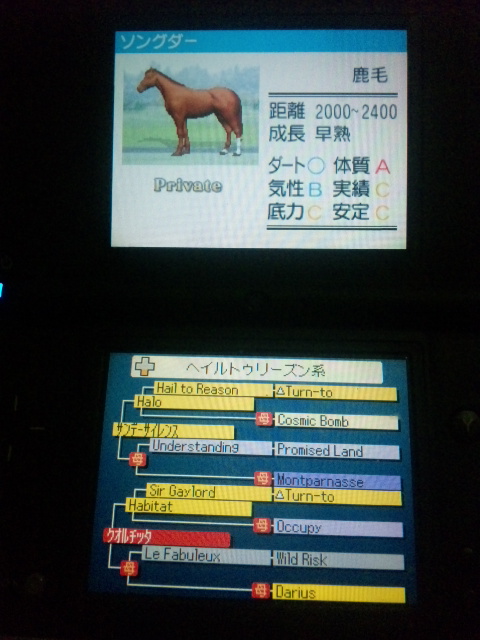 っというか100頭くらいしてやっとSPSTそろいの牝馬が めんどくさいので即採用しましたがどうもKSP30ない模様 で、今は虹をつけてますが好感触 STクロスがつくこととしっかりしていない事を 種付けしたときに気づく記憶力のなさですが STの感触が気持ちよいくらいです まだ牝馬10頭ほどしか種付けしてませんが、 最初の3頭が0耐0耐1耐とすべてSTコメありと好調 気分をよくして1耐切りを開始しても計10頭で2耐3頭1耐3頭とガンガン! かわりにSPは1頭のみ、2耐のときに付きましたがKSP30以下 SPまちなんてタマモ以来か? 競馬王 \(o ̄ ̄ ̄ ̄ ̄ ̄ ̄ ̄ ̄▽ ̄ ̄ ̄ ̄ ̄ ̄ ̄ ̄ ̄ ̄o)/ 追記 ブログを見返していたら、自家種作りを触れてませんでしたね クラフ×ルシファー 12-2400普○気B底B体A実B安C ゲーム内では弱く下限1800くらいかと思ったら1200とは 実績Aまで粘ろうかと思ったけど 栗毛だったので採用 出来たら栗毛のBC馬が欲しいので 〆牝が栗毛になってくれたらうれしいなぁ この馬の後SSクオルに行ってます で、そのさいにクオルと一緒にモンローエフェクトも購入 VTR馬つくりも兼ねて種付けしてました 2年目の種付けのときにモンローから9/1STコメ(即入厩)がでたのも セーブした要因になってるんですが、どうもSPコメは出なかった模様 で、現在の状態ですが SSクオル牝馬3歳→2年連続種付(初年度牝馬の際) SSモンロ牝馬2歳→2年目だけ種付け クオル&モンロ→2年目から自家種延命の為種付け 昨日は2年連続2耐牝とかでて熱かったのですが その後コメントがさびしくなってます、さすが安定C でも、STコメがでる生産は心にゆとりができます 母母の目標はKSP40↑-ST1耐↑ 〆牝ではRaiseaNativeとNasrullahのクロスができるので SPはちょっと低めでもいいかな~っと 2耐だったらKSP30↑でも採用するかも ここでKSP55-2耐以上引けたら自家種でも楽しめますけどね 16-13と4耐が狙えます でもSPが低いから使い道はなさそう PR