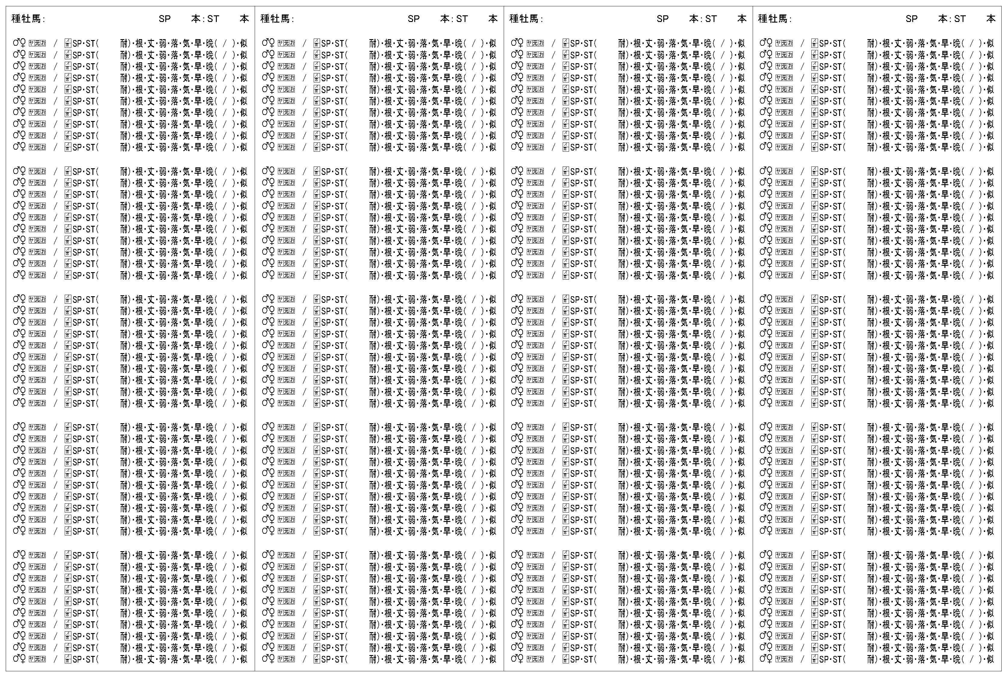 トーヨー×クオル牝(ksp50辺り1耐) デザキン×クオル牝(ksp55-1耐) この2頭体制でタヤスツヨシと格闘してきました 正直手ごたえが悪い、っていうか手ごたえがないw コメがなんにもでない、なんてのがちょいちょいあって やりがいがない、といのが正直な感想ですね そういう状況でSTはそこそこ1耐や1.5耐も見れますがSPが... 昨日までゆいいつ確認できた本物まがいはST1.5耐で しっかり確認対象外(2/4-5/4)での遅普通5/2SPコメ6/1入厩くらい 正直ノート1ページ分(34行×5列=170頭)がうまったら あきらめて別配合を検討しようかと考えてました そして本日あと12頭でノートがうまるところでうまれたのが 6/4しっかり やんちゃ SP・ST・根性・気性難・体質弱 とほぼフルコメw STは1.5耐まで確認、4/1入厩 ベスト馬体重が388kgから変わりませんでしたので 虚弱の超早熟の可能性は高いです 結果的に手持ちのksp30前後とksp49の馬から左2◎奪ったので 本物という事でセーブしました ST本数も数えてみたところ91本とこちらは十分跳ねてます 結局SPは若干足りないのですが、正直この馬を捨てるのはできません 〆が基本ミスプロ系でSPは出やすいと踏んでますので まぁよしとしましょう これからVTR確認して、いよいよ〆に向かいます (が、〆牝も並行して種付けします) 新境地&お買いもの&リンかけ番外編 新境地 新作SPのみ お買いもの&リンかけ ヤマニンゼファー 100万 ビーマイベイベー 逃先差追 ナリタトップロード 150万 ズミーファイユー 追 ksp72 0耐 カリスタグローリ 30万 ネグロポンティ 差追 ksp65 10-1600 早◎ACBAC スピードワールド 50万 アクアポリス 差追 ksp64 10-2200 普◎BABAC 新作 100万 逃先差追 SPそこそこSTそれなりサブしょぼしょぼ(でもバネ有) となぞの新作も先日引きました レギュラーメンバーには基礎サブともに1枚足りずといったところです PR