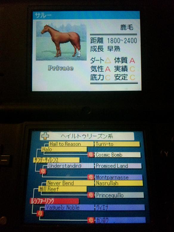 サンデー×ルシファをはじめて、 まぁなんというかGIが勝てない... バネコメはよく確認するけど、よくて3歳で3勝どまりとかが 続いてました やっとこさおとといこんなの引きました 名前はサンデー×ルシファの頭文字という安直 実績Bはほしかったけどこの際ぜいたくは言えません 18-2400は当初頭のなかでギリ予定内のパラなので (本当は14-3000とかほしかったけど) GIは4歳の安田記念でやっとこさ勝利 バネコメは確認できなかったけど、そこそこ印が厚く 失敗したらやり直しでいいや~と思いセーブした次第 クオル6歳でゲットするためには自家種候補を8歳まで 進めないといけないのな で、次のクオルがなかなか捕まらない 今日の昼までクオル探してやっとゲット 午後はクオルつけてましたが全然STがつかない... ちょうど30頭牝馬が産まれましたが しっかり16頭でSTコメ0 そのまま種付けすると1頭目は父似、2頭目に母似という流れ そして最終の17頭目が 元気・8/4・SP・ST・早熟・丈夫・母似で1.5耐↑がいきなり! 結果偽でしたが、牝馬の方がSTつきやすいのか? アウトだとニトロ拾うのでサンデーよりミルリーフ側の方が スタミナでやすいと思うけど Turn-toのクロスがあるから関係ないよな 2月4週まで1週づつ進めてそのあと月送りすると母似になりそうなので しばらく母似で試してみようか?