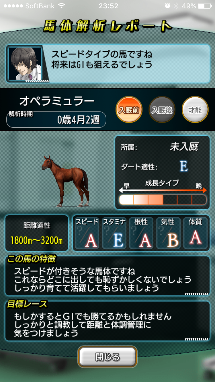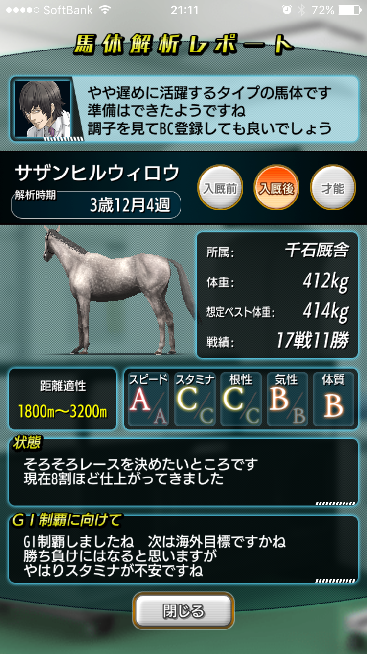 配合 父系 万重弱G1/C4DDCCD(普○体B気A実C底A安B) サトノダイヤモンド×スピードワールド×ウォーフロント×アクセスマップ 父系はサトノ付けても重賞勝ちがやっとの産駒ばかり、 実績Cしかうまれず。6頭種牡馬入りした中でこの馬が一番パラ良かった。 母系 素ダSP三/D3BCCCB グラスワンダー×キングスベスト×デビッドジュニア×エアジハード×ウルトラサブマリン 母系はデビッドジュニアまでは全然だめで完璧配合のキングスベストでBC グラスワンダーでもBC一頭、後はBDかBEで伸びず グラスワンダー26頭、キングスベスト7頭、サトノダイヤモンド12頭と ☆4を45枚使用して海外AC1頭のみというのは 効率悪いですねw まぁそれでも引けただけましかw 特別調教は大舞台Lv14付けてみたのですが スタミナ根性Cが低いせいか 大舞台対象のレースでは他の馬に見劣りしてしまい入賞がやっとです かえって直線が短い非根幹距離で走るほうが1着拾ってきます 付ける才能間違えてますねw まぁこれから始まるレジェンドBCで頑張って頂きたい この馬でやっとグラマスにもなれたし、シナリオも進みました よかったよかった で、いまやってる配合はダートです 過去作でも強いダート馬を一度も引いたことない身としては 思いっきり空振りの可能性高いですが何か引っかかってくれればと (また二兎を追うもの一兎も得ずな配合やってます) PR