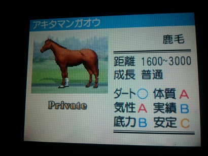 っていうか進展させましたw なかなかでないな~と思いつつだらだらと生産してたら おとなしい バネ・雰囲気 5/2しっかり(だったかな? がきて(この時点で下限1600確定? 2歳コメ 丈夫・ST・父似 以上!みたいな SPコメないしw 4/1入厩しないので遅普通 初戦芝6着以下にしてダート並走でコメントみると 「ダートのほうが向いている」とか言われて で、NHKマイルでGI勝って即引退 パラがこれ あれ、ダートが○だ... ダート◎確定じゃないのね(それともコメント勘違い? 無駄にスタミナもあるな~、根性もBだしな~ でも、もう東洋あきたしな~ 東洋も最初はノートにチェックしてましたが ノートない状態での生産が続いて結局最後までチェックしてないし だいたい300~400頭くらいやったし もういいや! で、セーブしちゃいました 今はハリカト探しの旅にでてます PR