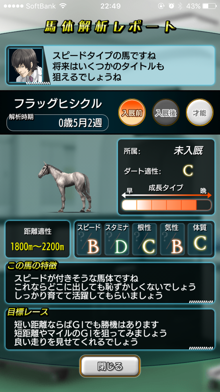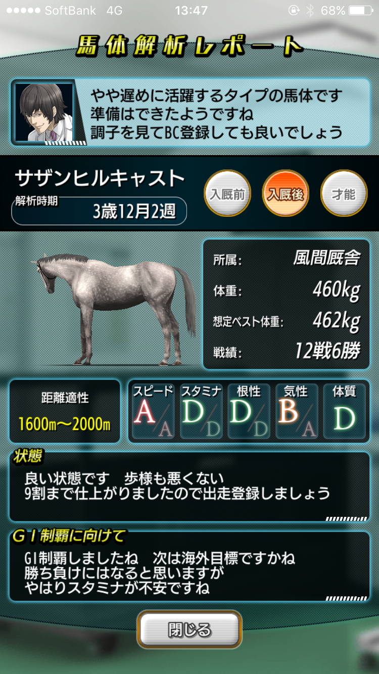 完璧のつもりがよくできたになって終了です まあジャイアントレッカーの完璧も出が良くなかったので まあいいか 気がついたら締めに安定Cを選ぶクセがあるようなので 次はとりあえずウォーウォーでもやろうかと この間アップしたヒシミナクルBDいくつか牝馬に 3頭目のスピードAでスタミナもDあるので そんで気付いたけど真壁が 写真ではスピードAになってますが3歳9月に確認したときは ほんとに仕上がったか確認するためには ふわっとした解析だなw 現在ジャイアントレッカー完璧まで来てますが