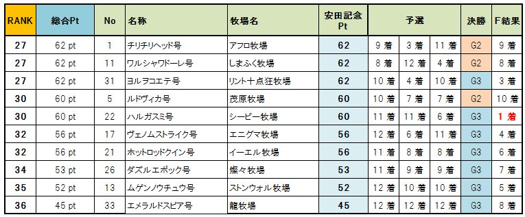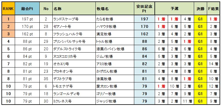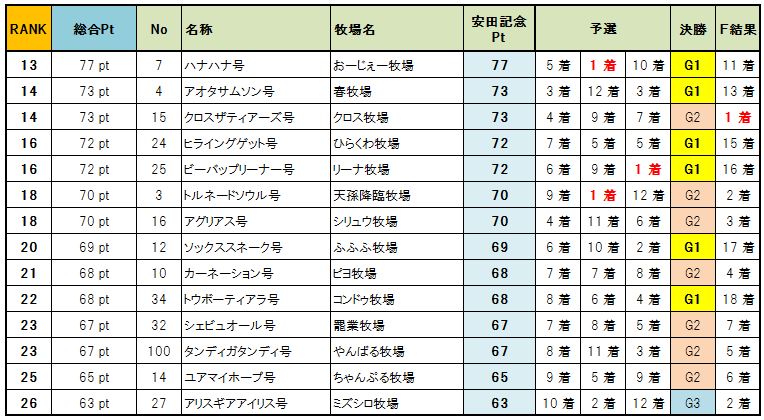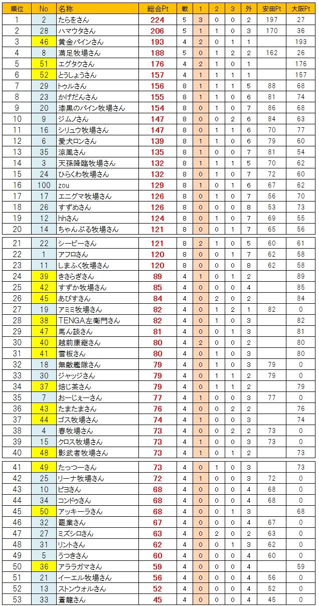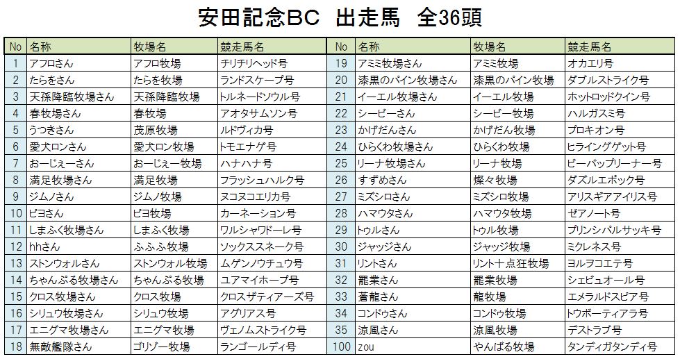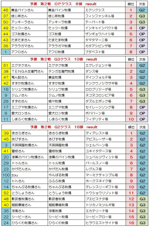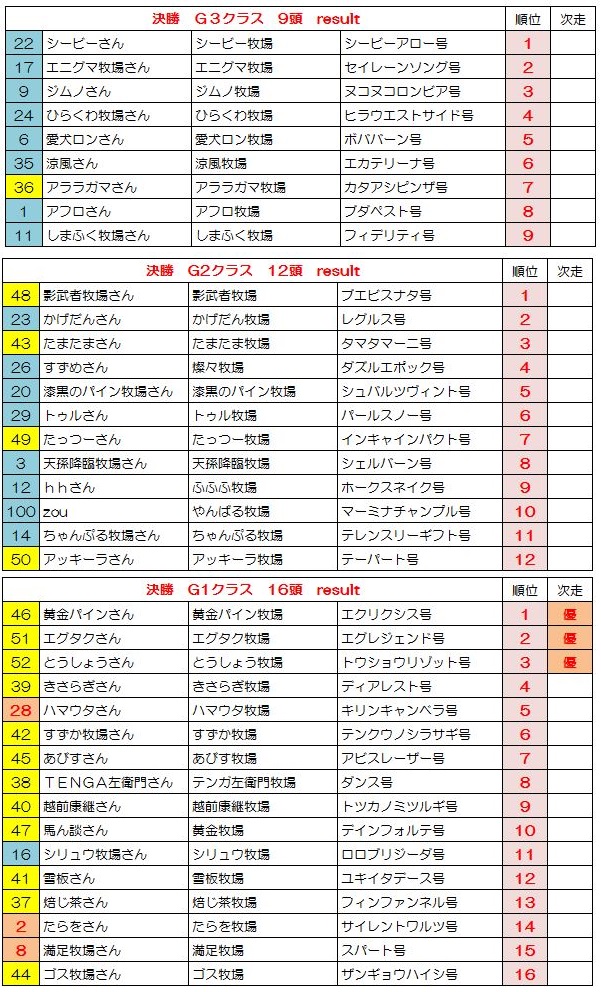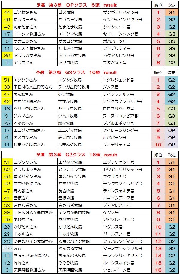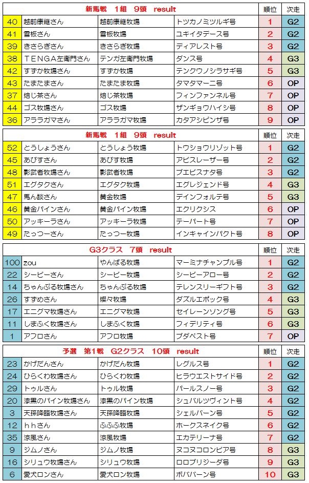 新馬戦 1組 1.54.2 直線先頭のユキイタデースをトツカノミツルギがかわし新馬戦勝利、1番人気テンクウノキサラギは5着 新馬戦 2組 1.54.0 直線混戦かと思われたが、トウショウソリッドが一気に突き放し勝利、2着にアビスレーザー G3戦 1.55.6 シービーアローをかわしたマーミナチャンプルが空気を読まず1着でゴール G2戦 1.54.1 直線抜け出し後続を寄せ付けない1番人気レグルス1着でゴール、2着にヒラウエストサイド 予選第2戦 OP戦 1.54.4 フィンファンネル逃げるもエクリシスにかわされ突き放される、3着にテーパート G3第2戦 1.53.8 逃げるダンスを追い込むエグレジェンド、壮絶なたたき合いはハナ差エグレジェンドに軍配 G2 1.52.9 シェルバーンをかわすディアレスト、さらにかわすアビスレーザーを差し返しディアレスト勝利 予選3戦 OP戦 1.54.7 インキャインパクトをザンギョウハイシがかわしG1出走権を獲得 G3戦 1.53.6 3頭のたたき合いかと思われたがトツカノミツルギが抜け出し5馬身差勝利、2勝目を挙げG1へ G2戦 1.51.3 エグレジェンドが突き放し2勝目、今大会ここまでで最速タイムをたたきだす 決勝 G3戦 1.55.5 シービーアローが逃げ切り勝利、シービー牧場さん決勝G3を2連勝です G2戦 1.53.6 ブエビスナタ4馬身差をつけて決勝G2勝利、影武者牧場さん初勝利です G1戦 1.51.2 G1の舞台にふさわしいたたき合いをクビ差制したのはエクリクシス、みごと大阪杯勝利! バーヌシーランキング ※予選決勝での順位にポイントをつけてランキング付したおまけ要素です 次回告知 非公式BC 第3回 宝塚記念募集 ひとりでBCにて処理 条件:宝塚記念に準ずる 募集締め切り 8月10日土曜日一杯 出走馬登録 8月11日 BC処理予定 8月12日~13日 動画アップ 8月14日以降