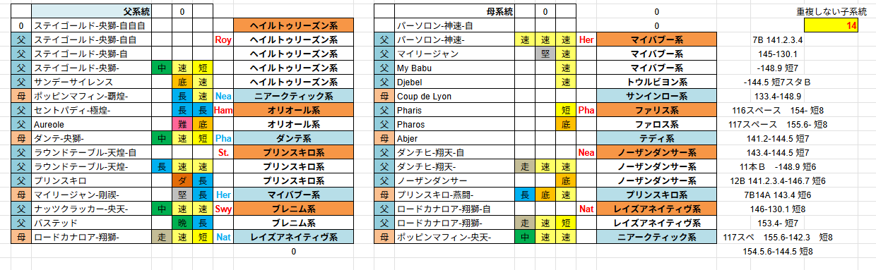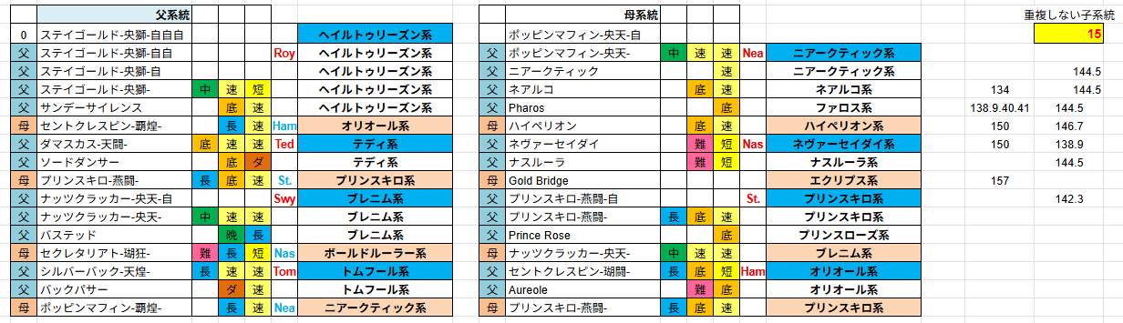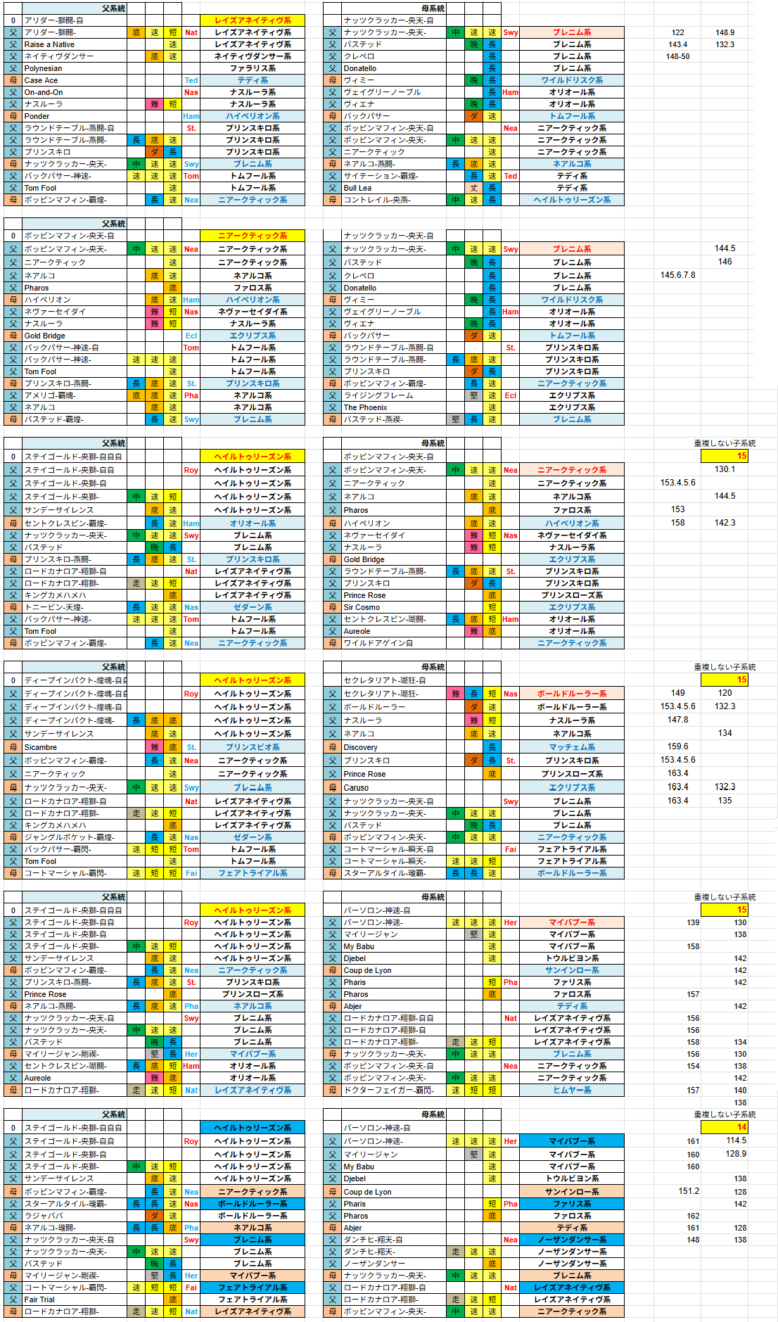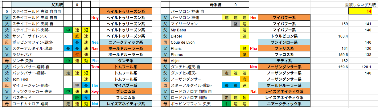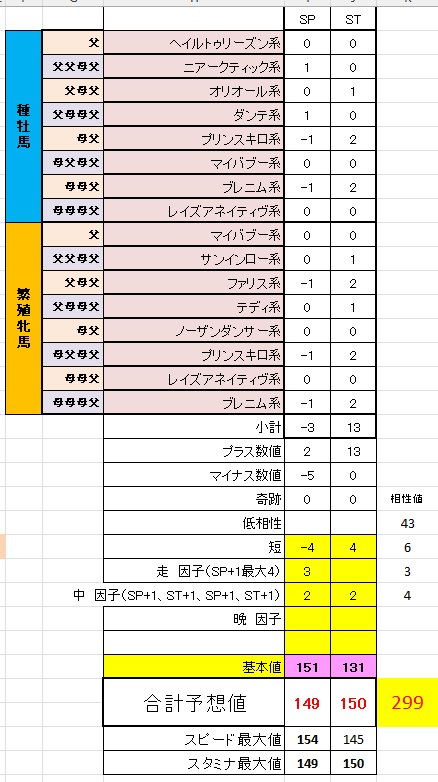 ダビマスのパーソロン母父直生産で気になったところを 久しぶりにだらだらと昔のブログにつらつらと なるべく楽に生産したいと思うやんばる牧場は リファール1薄やアリダー1薄、ステゴ1薄とか を中心に生産してました 1薄だと合計値が低いので、たまに3薄とかやっては 結果が出ない→1薄に のような生産を繰り返し そのような生産ライフの中で気になったのが 1薄でなんか思ったより跳ねた →じゃあ3薄にして子系統増やせばもっと跳ねるんじゃね? →爆死 が何回かあって、薄めないことで跳ねる要因があるのではないか そのころ子系統が多いと跳ねるのでは? という意見がポストでちょいちょい出てきてたので 速攻で乗っかることに 子系統計算も作ってみたり 子系統増やすなら ネアルコ→ニアークティック→ノーザン のように系統途中で変わるやつをなるべく薄めずに入れないと 種1薄では安定Cで縛ると手持ちかなり少ない →母父を直でやれば結構候補いるのでは 種牡馬の子系統計算できるやつを作ったり (USBが物理的に壊れた影響でファイル無し) その時に調べた候補から生産したのが ①アリダー1薄×ナッツ直 最大値(SP148/ST148)かみ合わず ②ポップン1薄×ナッツ直 最大値(SP145/ST145) かみ合わず ③ステゴ3薄×ポッピン直 最大値 記録無 (158-142.3馬神様)15系統 ④ディープ3薄×セクレタ直 最大値(SP163/ST135)(163-135)15系統 ⑤ステゴ3薄×パーソロン直 最大値(SP158/ST142)(157-140)15系統 ⑥ステゴ3薄×パーソロン直 最大値(SP162/ST142)かみ合わず14系統 と生産 ⑤⑥連続でパーソロンを生産してますが、⑤はスタより⑥はスピよりに配合をいじる 具体的には ⑤プリンスキロとオリオール ⑥ボールドルーラーとフェアトライアル で入れ替える形にしたんだけど ⑥でスピード最大値が増えたのはわかるけどスタミナ最大値がともに142出ているのが不思議 子系統の数的にスタ142は届かないと思うのにスタ最大値が減ってない これが子系統の数や薄めずに生産することで付くボーナスなのではと考える このころXにスピはスタ、スタはスピ などと妄言をポストしたり 次にステゴ3薄×ポッピン直で子系統スピスタ混在で生産すると ステゴ3薄×ポッピン直 最大値(SP157/ST146)(150-146.7)15系統 スピスタ最大値の合計だと303とかまで出るんか? とうっさくゎっったいして生産したけど最大値は296まで 謎を残したまま公式生産で170↑を目指したりアリダー1薄、アリダーナッツ奇跡やったりで 成果出ず 公式締め切り~次回条件発表まで間が空いたので 改めてパーソロン母直を再チャレンジ 最初はスピ型で ステゴ3薄×パーソロン直 最大値(SP162/ST141)(159-141、159-138)14系統 生産しょっぱなで馬神様を引き当てたりしながらやっぱりスピスタ最大値303→300 の結果に頭をひねる で次にスタ型に変更 スターアルタイル×2バックパサー翔→セントパティ、ラウンドテーブル+プリンスキロ 走因子が1つ減るのでおそらく馬神様は出ないだろうと思いながら生産開始 現在進行中ですが ステゴ3薄×パーソロン 最大値(SP155/スタ148) 155-142 短8 154-144 短8 155.6-142.3 短8 153.4-146.7 短6 とおそらく300に届かない強強が連発 このスピスタ最大値にブレがあるのに最大値が近いか同数なことの謎を 破竹付を引いた当たりからぼんやり考えながら仕事していたら 天啓を受ける スピード大アップやスタミナ大アップのマイナス要因分増えてるんじゃね? 急ぎ自前エクセルツールをプチ改造して計算するとなんとなく辻褄があう ついでにファリスをスタミナ大アップにすると辻褄合わせにハマる 考えてみたらスピード最大値やスタミナ最大値を目指そうとしたら 大アップ子系統をなるべく外すけど、母父直だと外しようがないのでスピスタ大アップが 混在しやすくなって最大値がばらつくことに気づけたのかも 以上がパーソロン母父直を生産した結果をもとにした考察です ファリスの効果も検証したわけではないので、偶然しっくりきただけかもしれません 信じるか信じないかはあなた次第です 最後にふふ牧場さんのノートやおえるげ牧場さん検証、 リファ1薄研の皆様 ほかたくさんのダビマサーの検証やポストを参考にさせて頂きました 検証結果を惜しみなくだして頂きありがとうございます PR 七々々牧場さんや冬月牧場さんがアップしてくれたデータをもとに 種牡馬繁殖牝馬検索用ダウンロード new! ダビマス才能検索エクセルダウンロード new! ※夏火星♪ 春雷極光 迅空吐月 秘境星鏡 まで更新 才能検索は更新止まってます